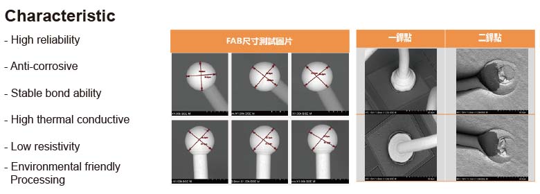 After long process of research and experiments Niche-tech successfully developed a copper alloy bonding wire by evenly mixing appropriate doping into 5N pure Copper. The alloy wire process is more environmental friendly, lower cost with similar reliability in compare to the Pd coated copper wire. In addition, the Alloy wire having a better anti-chlorine and anti-electrical fatigue properties.