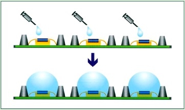 骏码半导体材料的LED灯丝成型封装硅胶为成型高触变性半球形状,产品附着力好,强度适中,因为触变性高,适用于LED灯丝灯、COB等产品的封装。产品对玻璃、铝、陶瓷、银、PPA等黏结性能优异,产品固化后成型性能好,透光率好,流明度高,高温不冒油不起雾,热稳定性优异。