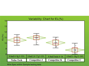 Self inductance and self capacitance are nearly the same and Cu bonding wire has lower resistivity. In applications of QFP, QFN and SOIC where resistance due to bond wire can negatively impact circuit performance, using Niche-Tech Cu bonding wire can offer better improvement. Also, a tailor-made concept of Niche-Tech is partnering with various interested parties for advanced packaging to continue to expand knowledge and lead technology development.